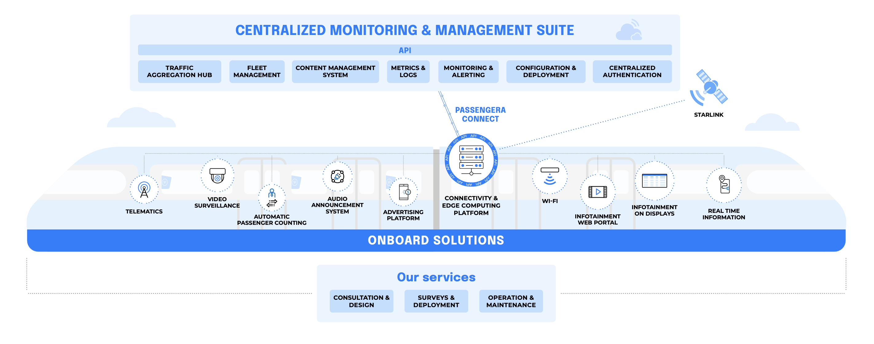 Passengera’s robust, secure, scalable and fully integrated Connectivity & Edge Computing solution delivers flexible onboard platform for your business cases, that is cost efficient and results oriented. It unites our advanced connectivity core with PassengeraOS, high-performance multi-service onboard gateways, hardware agnostic secure onboard application orchestration and intelligent cloud-based Monitoring & Management Suite.