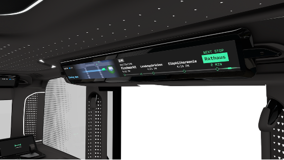 The user experience in the HOLON urban is designed to be distinct from traditional vehicles with drivers. Passengers are guided throughout their entire trip via smart displays and dynamic audio-visual announcements, providing real-time information on route progress, estimated arrival times, stops, or even unexpected changes. The system ensures passengers are fully informed from before boarding, during the ride, and upon exit.